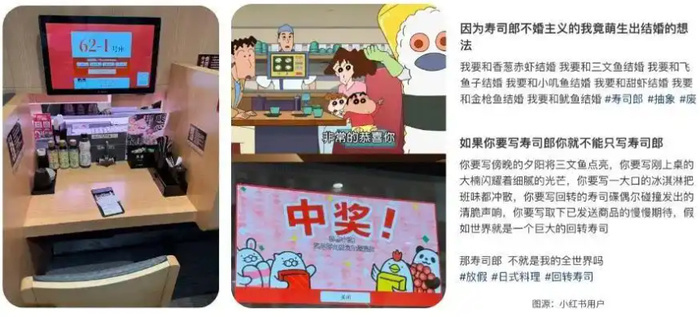 此外,联名促销精准击中年轻人的社交需求。许多人去寿司郎是为了打卡蜡笔小新同款,除了小新,寿司郎还跟初音未来、崩坏星球铁道、排球少年等人气IP合作,甚至推出了自有的IP角色团“萌抱寿司”,乐趣无穷,复购率极高。在社交媒体上,郎的狂热信徒们拍漂亮饭,晒战绩比拼盘子高度,还搞起了“寿司郎文学”,这些统称为“郎的诱惑”。