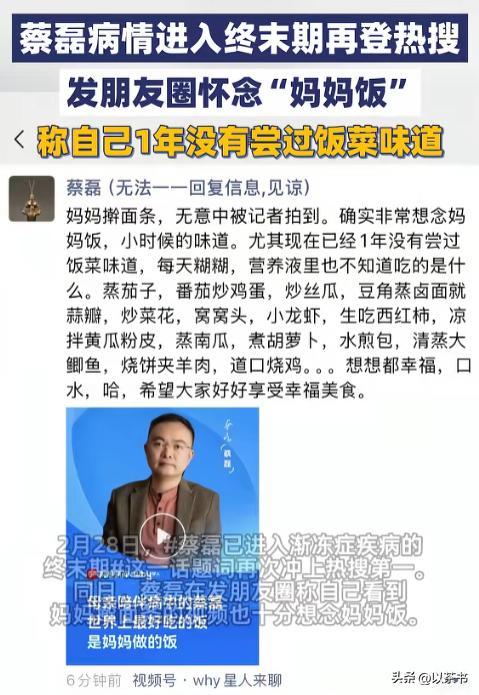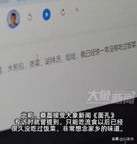 发这条动态的人叫蔡磊,配文写道,已经一年没尝过饭菜的味道了,每天只能吃糊糊和营养液,特别想念妈妈做的饭,还有老家的水煎包和胡辣汤。